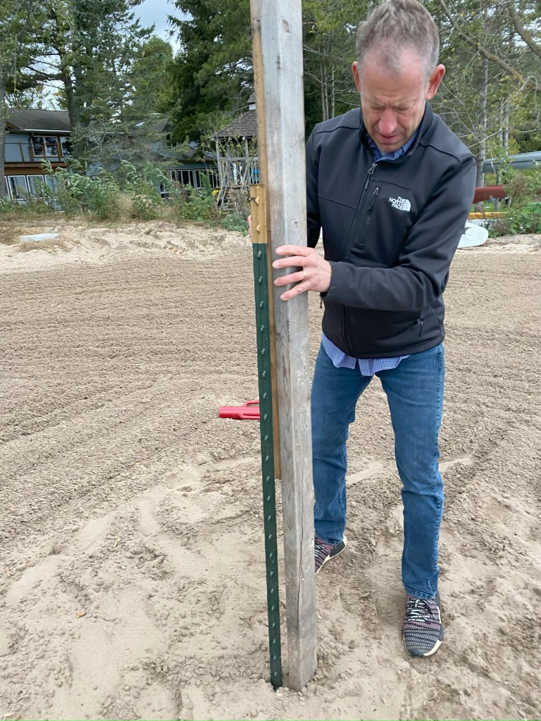 Start with identifying a spot that’s large enough for a bonfire and chairs/logs around it. You’ll want to stay clear of any trees or shrubs. We live on a lake, so we set our bonfire up right on the beach. But anywhere will do!