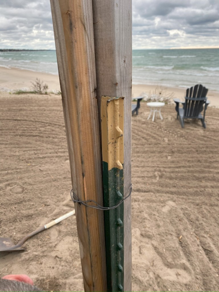 Set your bonfire pit in the middle of your space. Next hammer in metal posts around the “4 corners” of your area. Then, hammer 1 wooden post next to each metal post in each “corner”. Using wire or twine, tie the 1 metal post and 1 wooden post together to create support.