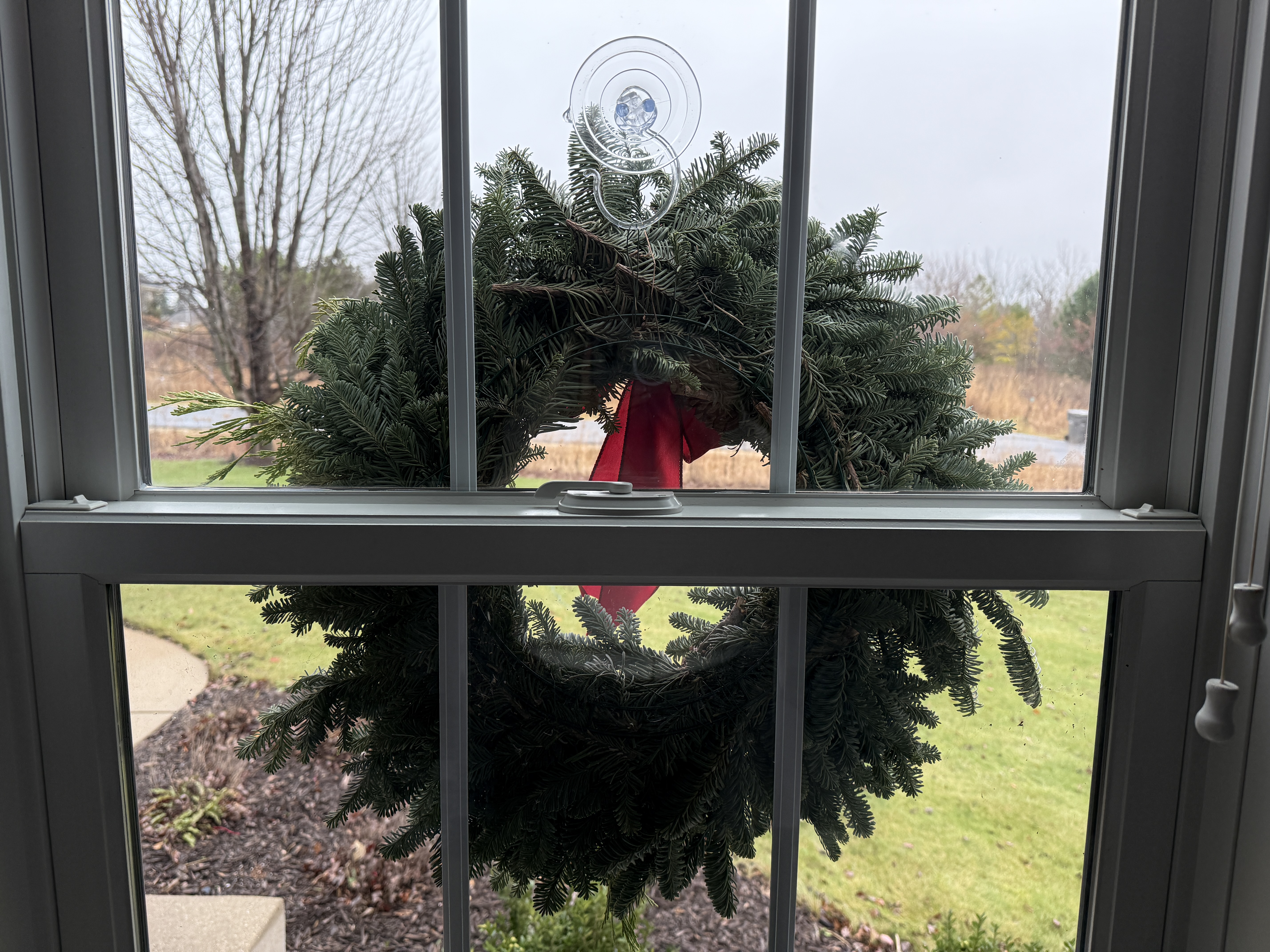 - Note: Hang the 1st wreath on a 1st floor window so you can figure out exact location of suction cup and wreath. If you need to change it or move around, it’s easy because you can stand outside and move around until you like the location. Once you find the correct positioning, you can easily duplicate it on the rest of the windows. When it’s time to do your 2nd floor windows, you can follow the above steps doing it inside.