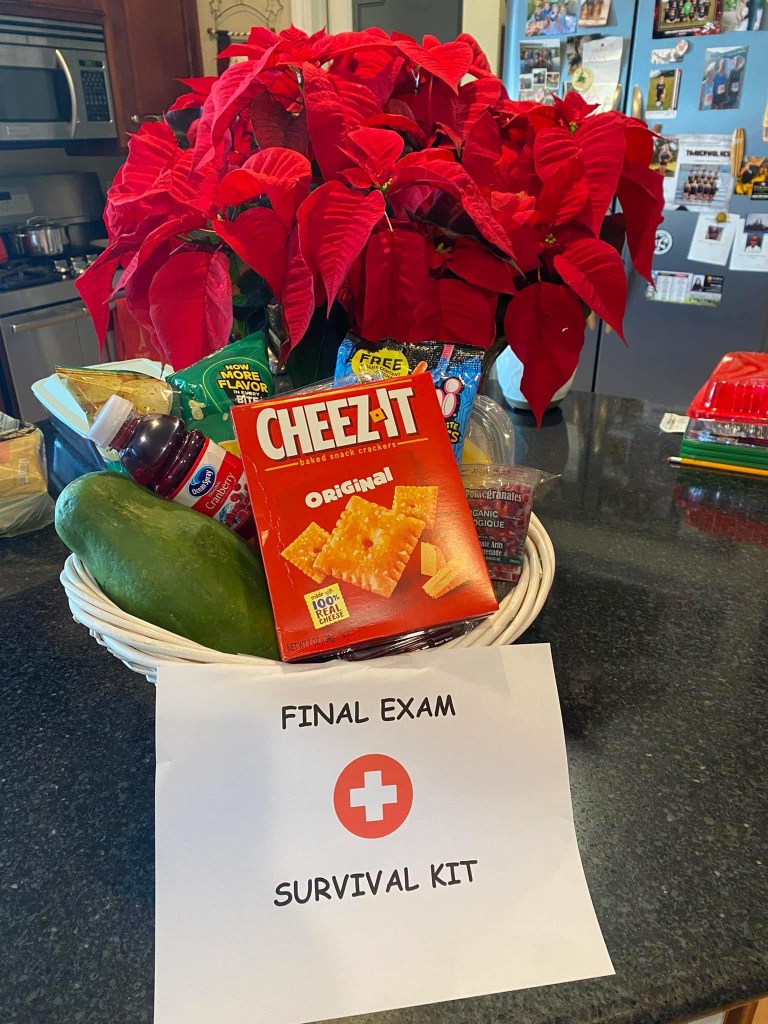 - Make a Sign & Adhere to the front of the basket. You can hand write or print a sign that simply says “Final Exam Survival Kit”. That’s it! You’re done!
